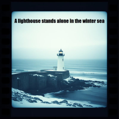 A lighthouse stands alone in the winter sea