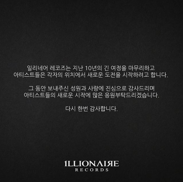 더콰이엇, 도끼, 빈지노가 소속된 일리네어 레코즈(ILLIONAIRE)가 10년 만에 해체한다고 합니다. 일리네어 레코즈는 7월 6일 “지난 10년의 긴 여정을 마무리하고 아티스트들은 각자의 위치에서 새로운 도전을 시작하려고 한다”고 밝혔습니다. 지난 2011년 더콰이엇과 도끼가 설립한 레이블로 빈지노가 함께하며 최근까지 대한민국 대표 힙합 레이블로 자리를 지키며,