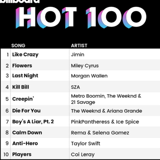 지민의 솔로앨범 타이틀 [Like Crazy]가 빌보드 HOT 100에서 진입과 동시에 1위를 차지했습니다.
